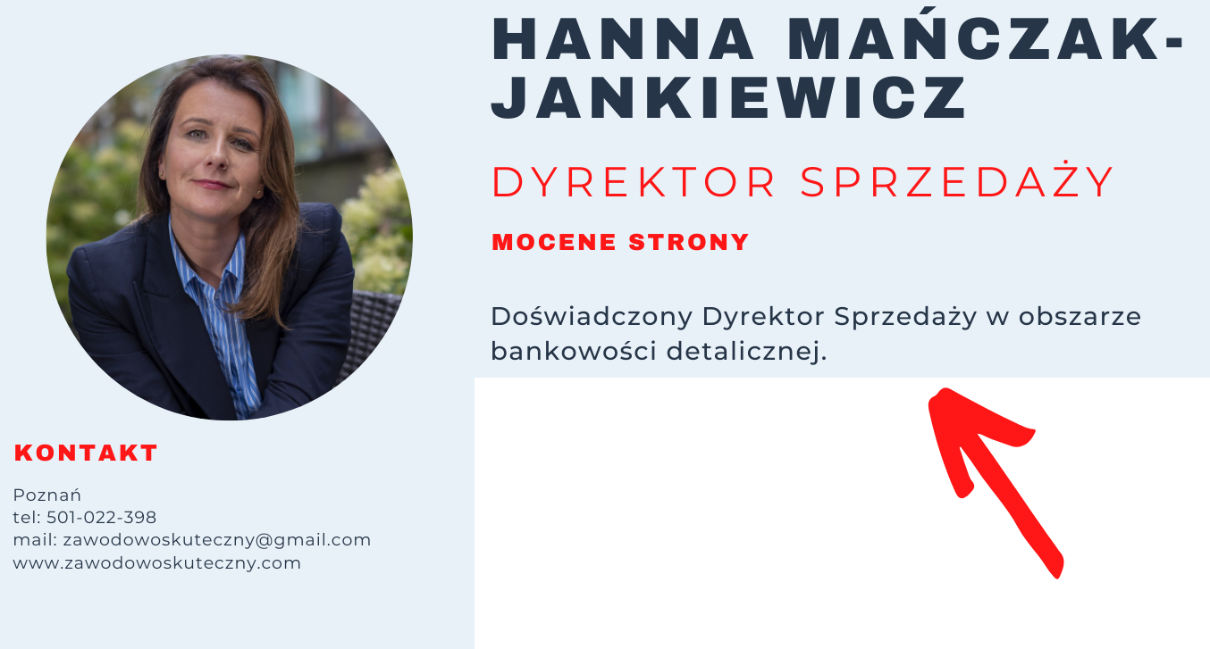 Nazywam się Hanna Mańczak-Jankiewicz. Jestem Trenerem Biznesu i Kariery. Więcej o mnie przeczytasz Klikając Tutaj. Zapraszam